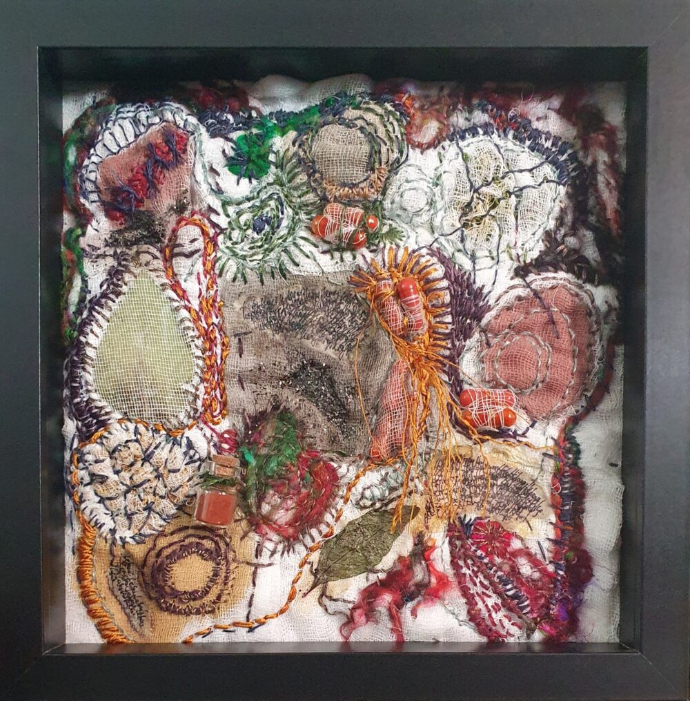 Mixedmedia mit Textilien, selbstgekochten Tinten, getrockneten Pflanzen und Heilmitteln auf Verbandmull 25x25x1,5 cm